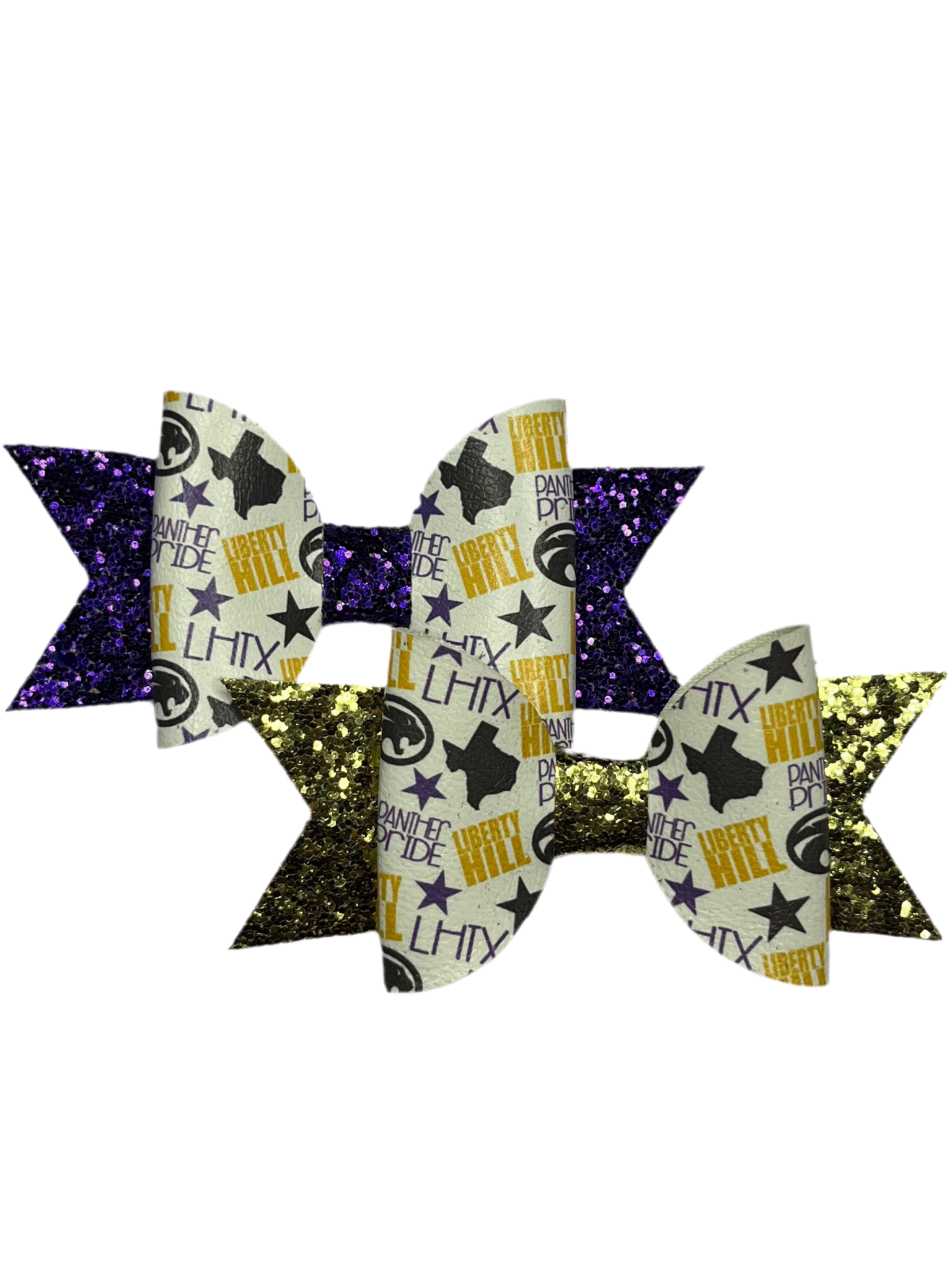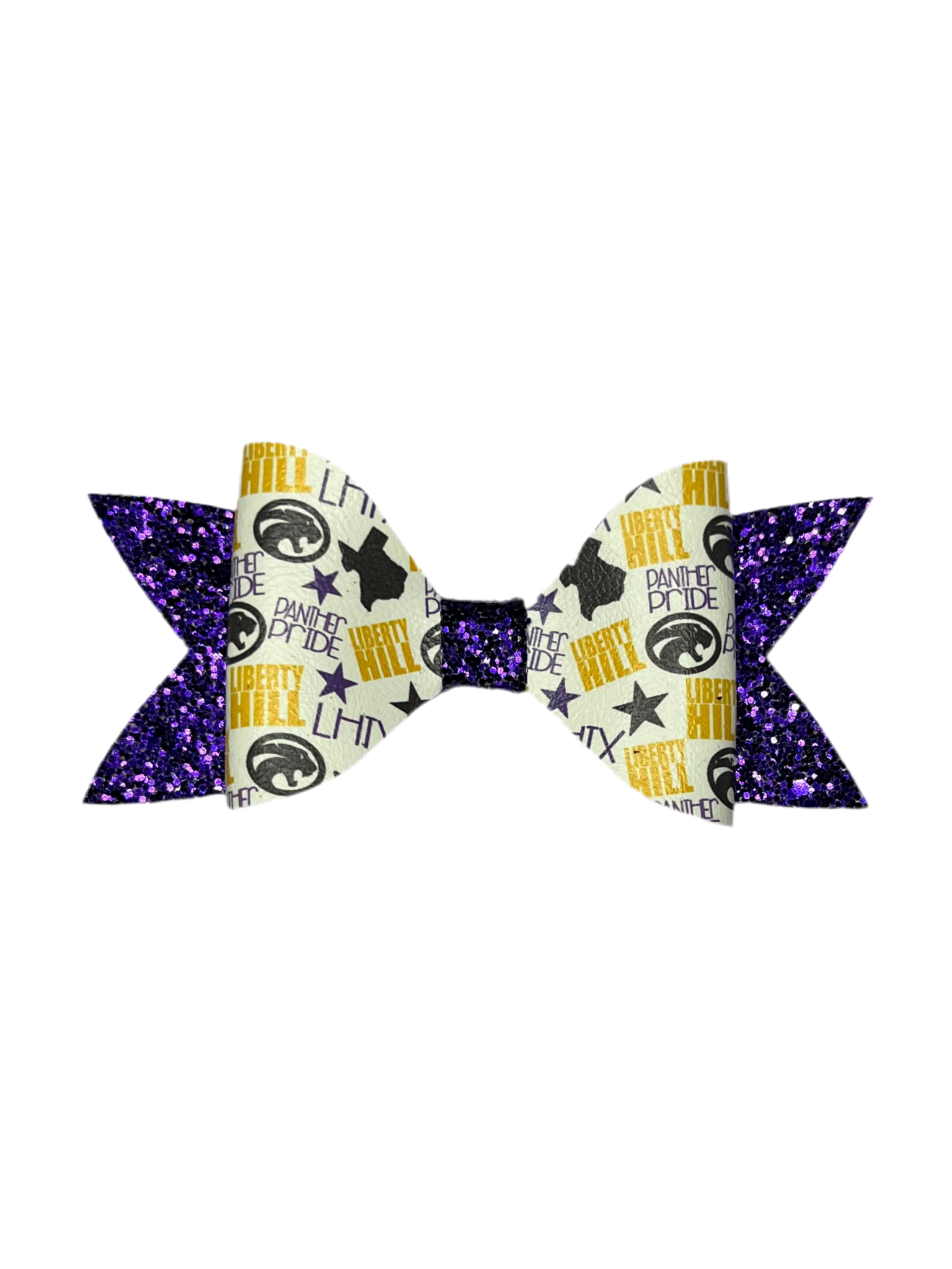 3.5" o Panther LH Print over Purple Glitter with Metallic Purple Bow with alligator clip